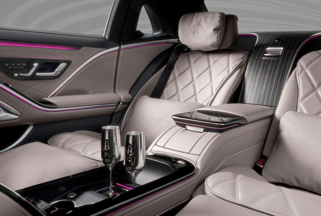 インテリアも限定モデルならではの特別仕様が随所に施されています。シートには通常は有償オプションとなる「MANUFAKTURローズグレー/ブラック(ナッパレザー)」を採用し、ヘッドレストにはマイバッハロゴを刺繍。リアシートは左右独立式のファーストクラスパッケージとなり、格納式テーブルやシート同色のクッション、さらにシャンパングラスとクーリングボックスを標準装備。まさに移動するプライベートラウンジのような贅沢な空間を実現しています。