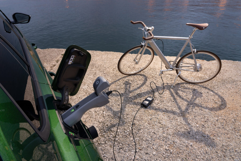 今回の最大のトピックであるV2L機能は、最大3.6kWの電力供給が可能です。専用のV2Lアダプターを充電ポートに接続することで家庭用コンセントとして機能し、eバイクの充電や電気バーベキューの使用、さらには掃除機などの家電製品の利用も可能となります。キャンプやアウトドアはもちろん、日常生活においてもクルマが電源として活躍するシーンが広がります。