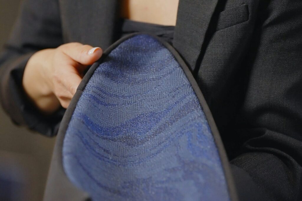 トゥールビヨンにおける最大の革新のひとつが、ブガッティ初となるファブリック素材の採用です。ファッション業界のメーカーと連携し、自動車用途に適応させることで、これまでにない素材コレクションを実現しました。中でも注目されるのが、日本・京都で製作された手織りテキスタイルです。金属糸と和紙のストリップを織り込んだこの素材は、深みのある質感と柔らかさを兼ね備えています。
