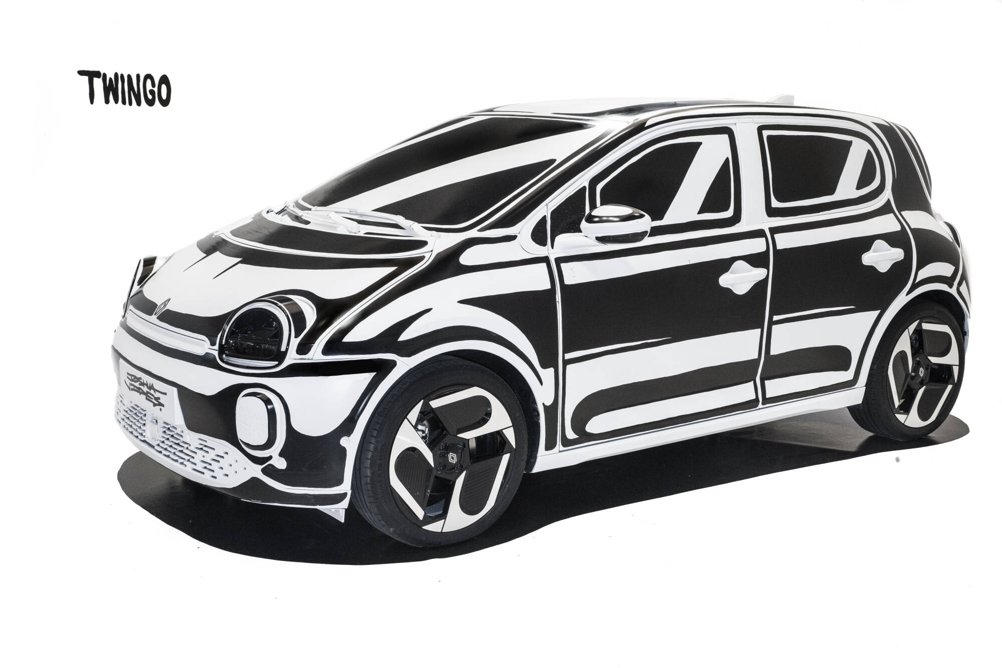 ヴィーダスの特徴であるモノクロのグラフィックスタイルは、漫画やカートゥーンから着想を得た明確な輪郭線によって構成されています。この手法により、立体的な実物をまるで2次元のスケッチのように見せる視覚的錯覚を生み出します。今回のトゥインゴも例外ではなく、現実とイラストの境界を曖昧にする独特の表現で、新たな存在感を放っています。