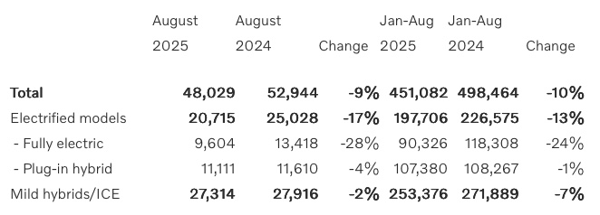 電動化モデル(BEVとPHEV)は2万715台を記録し、販売全体の43%を占めましたが、前年同月比で17%減少しました。このうちBEVは9,604台で全体の20%を占めるものの28%減少、PHEVは11,111台で23%を占め4%減にとどまりました。一方、マイルドハイブリッドおよび内燃機関モデルは27,314台で前年比2%減少に抑えられています。