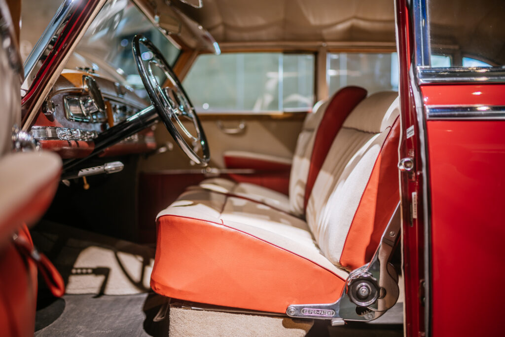 エクステリアは堂々たる体躯に加え、流麗なフェンダーラインと控えめながら存在感あるクローム加飾が特徴です。前フェンダーからドアへと自然につながる曲面造形は優雅そのもの。展示車両はミディアムレッド(DB516)で仕上げられていますが、当時は落ち着いた色調が主流だったため、この鮮やかな赤い個体は極めて珍しい存在です。大きなトランクルームや低い荷室開口部、左右に備わるスペアタイヤ収納部など、実用性も高水準でした。